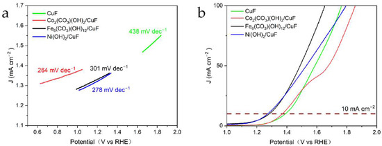 (a) Linear sweep voltammetry (LSV) and (b) corresponding Tafel slope for Co2(CO3)(OH)2/CuF, Fe6(CO3)(OH)12/CuF, Ni(OH)2/CuF, and bare CuF.
