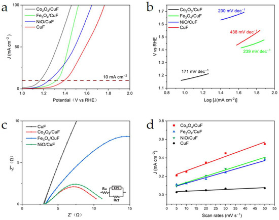(a) Linear sweep voltammetry (LSV), (b) corresponding Tafel slope, (c) electrochemical AC impedance spectroscopy (EIS), and (d) electrochemical active surface area (ECSA) tests for Co3O4/CuF, Fe3O4/CuF, NiO/CuF, and bare CuF.
