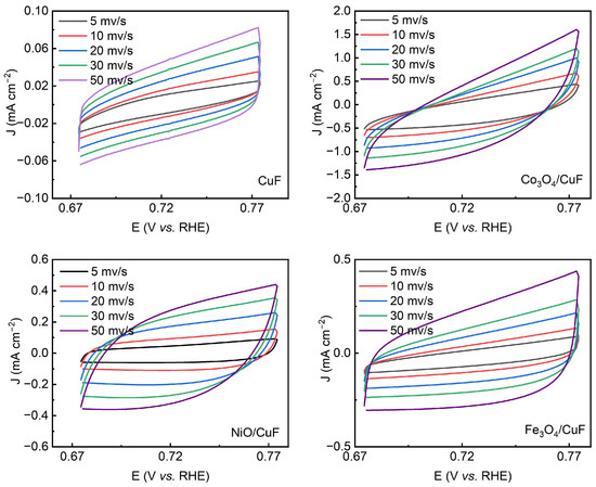 In addition to linear sweep voltammetry (LSV) tests, we conducted comprehensive electrode reaction kinetics analysis on the oxide-loaded electrodes. As shown in Figure 8c, the electrochemical impedance spectroscopy (EIS) spectra of these electrodes exhibited typical semicircular patterns. Among them, the Co3O4/CuF electrode displayed the smallest charge transfer resistance (8.25 Ω), whereas the NiO/CuF, Fe3O4/CuF, and unloaded CuF electrodes exhibited resistances of 12.2 Ω, 23.6 Ω, and 186.9 Ω, respectively. These results confirm the superior catalytic reaction kinetics of Co3O4/CuF in the tested system. The CV curves of all the electrodes at varying scan rates were also analyzed to evaluate electrochemical active surface area (ECSA) via double-layer capacitance (Cdl) fitting. As shown in Figure 8d and Figure 9, and Table S1, Co3O4/CuF demonstrated the highest Cdl value and ECSA among all the electrodes. The CV curves of Co3O4/CuF exhibited distinct oxidation/reduction peaks with increasing peak currents at higher scan rates, indicating excellent electrochemical reversibility and catalytic activity. In contrast, Fe3O4/CuF and NiO/CuF showed smaller peak currents and broader redox peaks, suggesting slower reaction kinetics and lower catalytic activity.