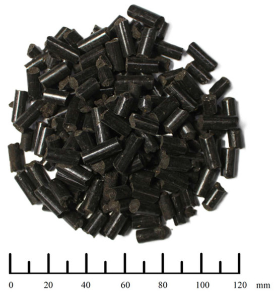 In this study, pre-treated sewage sludge is used as the feedstock for the experiments. The sludge comes primarily from municipal wastewater and, to a lesser extent, from industrial wastewater. It is provided, dried, and pelletized by the company SET GmbH & Co. KG., Augsburg, Bavaria, Germany. The pellets are of a dark black color, which is characteristic of dried sewage sludge (Figure 2), and exhibit high mechanical strength.