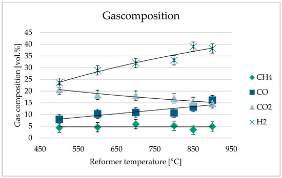 Figure 6 illustrates the progression of the syngas composition of the individual components in relation to the temperature profile of the Reformer. The volume fraction of carbon dioxide in the syngas decreases with increasing Reformer temperature. The methane concentration remains nearly constant in all experiments, while the proportion of hydrogen and carbon monoxide in the syngas increases with higher reforming temperatures. Neumann et al. reported similar effects regarding the concentration of hydrogen and carbon dioxide in the product gas in their studies on the variation in post-reformer temperature in TCR® process during the conversion of sewage sludge [21].