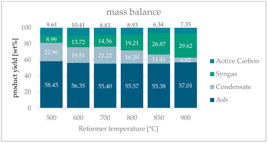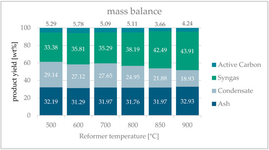 Figure 7 shows the product yield of the gasification of sewage sludge as a function of increasing reformer temperatures from 500 °C to 900 °C, based on the total input. The total input consists of feedstock, steam, air, and purge nitrogen. The yield of syngas was determined by differences.