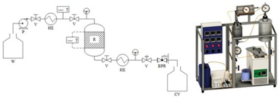 Schematic diagram of the experimental apparatus for the subcritical water processing of grape pomace. Legend: W, reservoir tank; P, high-pressure pump; V, shut-off valves; P, pressure meter; T, temperature sensors; R, subcritical water processing reactor; HE, heat exchanger; BPR, micrometric valve; CV, collection container.