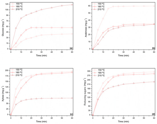 Kinetic profile of accumulated reducing sugars during the subcritical water processing of grape pomace: (a) glucose, (b) arabinose, (c) xylose, and (d) total reducing sugar content (sum of glucose, arabinose, and xylose).
