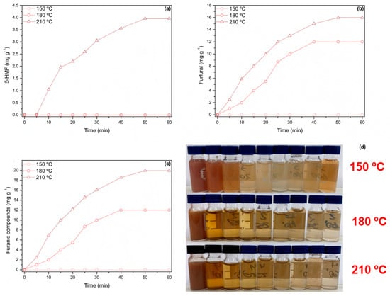 Kinetic profile of accumulated furanic compounds in the subcritical water processing of grape pomace: (a) 5-hydroxymethylfurfural, (b) furfural, (c) total furanic compound content (sum of 5-hydroxymethylfurfural and furfural), and (d) visual appearance of hydrolysates after subcritical water processing.