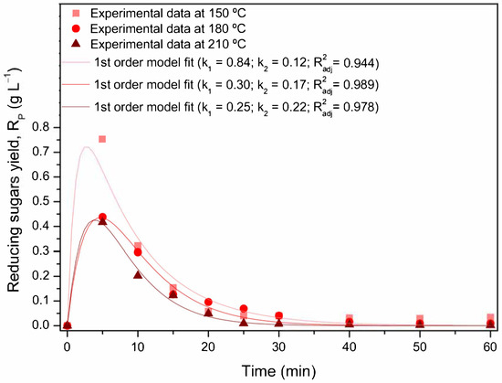 A first-order reaction model was developed to analyze the competing kinetics of reducing sugar formation and degradation across different temperatures. Experimental data and model predictions at 150 °C, 180 °C, and 210 °C are presented in Figure 4, with theoretical values calculated using Equation (8).