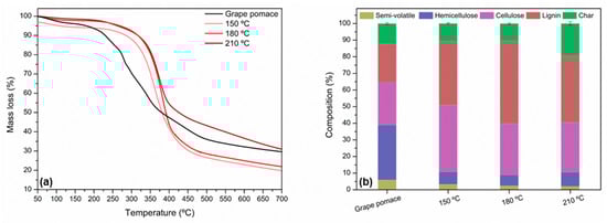 Characterization of solid residues: (a) Thermogram of grape pomace and solid residue before and after subcritical water processing and (b) lignocellulosic composition of grape pomace and solid residue following subcritical water processing.