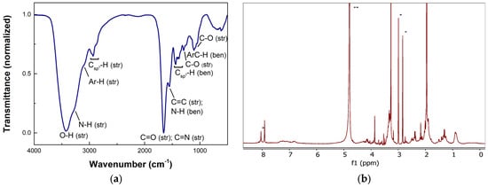 (a) FTIR (KBr) and (b) 1H NMR (400 MHz, D2O, 25 °C) spectra of TWCDs synthesized using a [TW] = 30 mg/mL, and an EDA/TW mass ratio = 0.32 at 200 °C during 60 min; DMF (5 mM) used as internal standard is denoted by an *, and residual solvent by **.