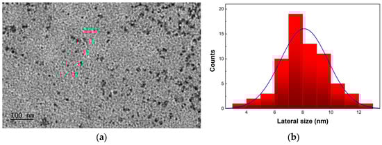 The TWCDs were morphologically evaluated through transmission electron microscopy (TEM) and atomic force microscopy (AFM). Both techniques revealed that diverse levels of aggregation occur upon drying the solution of TWCDs on TEM/AFM substrates. That such aggregation occurs at a molecular level, involving small to medium size molecular species existing in solution, leading to the formation of supramolecular structures which are assembled upon removal of the solvent to achieve the solid form in various lateral sizes and heights, has been demonstrated in a recent study [34]. Under our conditions of observation (see Section 2), TEM images of TWCDs show nanoparticles ranging from 3.5 nm to 12.5 nm in their lateral size (Figure 2a), with an average size of 8.1 ± 1.7 nm by statistical analysis (Figure 2b).