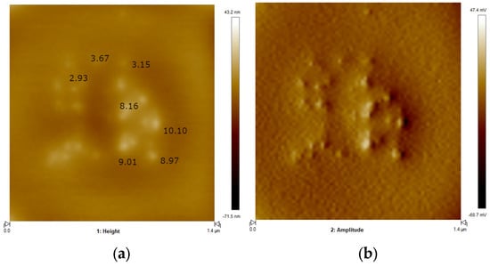 (a) Topographic image 2D of TWCDs’ nanoparticles, displaying measured heights (nm), and (b) the corresponding amplitude image. Height color bar range: −71.5 nm (bottom) to 43.2 nm (top); amplitude color bar range: −60.7 mV (bottom) to 47.4 mV (top).
