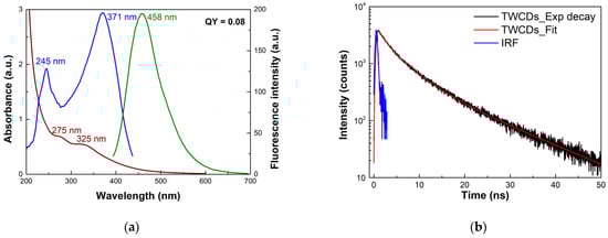 The photophysical properties of CDs were studied by UV–Vis, steady-state, and time-resolved fluorescence spectroscopies. The ground-state absorption, excitation, and emission spectra of aqueous solutions of TWCDs are shown in Figure 4a. The absorption profile exhibits bands around 275 and 325 nm, with an absorption cut-off near 600 nm. The band at higher energy is assignable to π-π* transitions of sp2-hybridized carbon structures, and the latter to n-π* and π-π* mixed transitions of conjugated systems (e.g., carbonyl, carboxyl, and imine functions conjugated to unsaturated carbon) [33]. The emission of TWCDs is dependent on the excitation energy, with the maxima emission wavelength shifting to the red on its decrease (Figure S4), with a concomitant lowering of the intensity of emission, which may be due to the decrease in absorption. The observed emission tunability may likewise be a result of the spectral heterogeneity of the single emitters, possessing different dimensions and structural features [61]. When excited at 380 nm, the emission spectrum revealed the most prominent band (FWHM = 0.49 eV) peaking in the blue region at 458 nm, with a QY of 0.08. The excitation spectrum, when monitored at 460 nm, showed two main transitions peaking at ca. 245 and 371 nm, with a much larger contribution from the latter chromophore. A significant photostability of TWCDs was found upon continuous irradiation of a CDs’ sample for ca. 60 min (Figure S5).