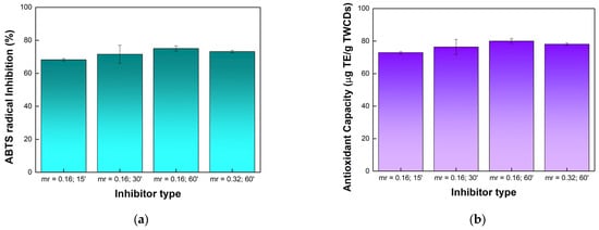 Concerning the TWCDs’ antimicrobial applications, it is important to evaluate the surface charge of the nanomaterials, since their potential toxic effect is highly dependent on TWCDs–cell interactions [60]. The zeta (ζ) potential of TWCDs aqueous solutions synthetized using EDA/TW mass ratio of 0.16 during 15, 30 and 60 min are, respectively, −11.0 ± 4.8 mV (at pH = 9.25), −9.7 ± 2.5 mV (at pH = 9.06), and −19.5 ± 4.7 mV (at pH = 8.83). Increasing the EDA/TW mass ratio to 0.32, but keeping the dwell time at 60 min, a deep reduction in the zeta potential (ζ = −3.9 ± 0.5 mV; at pH = 9.52) was observed. The TWCDs obtained without an additive during a 15 min reaction time also showed a negative potential (ζ = −7.9 ± 1.4 mV; at pH = 8.17). No clear-cut trend could be observed between the samples prepared under the diverse conditions used, viz., dwell time and amount of added amine or even in its absence.