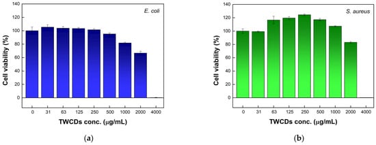 Antimicrobial activity of TWCDs (synthesized using a [TW] = 30 mg/mL, EDA/TW mass ratio = 0.32, 200 °C, 60 min) at various concentrations (31–4000 μg/mL) against (a) E. coli and (b) S. aureus, expressed as a decrease in cell viability obtained by resazurin microtiter assay. Data represent mean ± SE, n = 3.