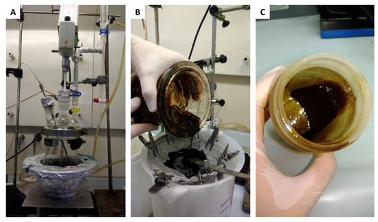 The procedure used was optimized in previous studies on pinewood liquefaction [25,26]. All liquefaction experiments were carried out in duplicate at 160 °C and ambient pressure. The catalyst used was 3 wt% versus the organic matter content of the biomass; the biomass (50 g) to solvent ratio was 1:5 and the reaction time was 120 min. For maritime pine sawdust, a reaction time of 180 min was also studied. The reactions were carried out in a four-neck reactor with a mechanical agitator (Figure 1). One of the necks was attached to a Dean–Stark separator/condenser to collect the reaction condensates and a thermopar was placed in another neck.