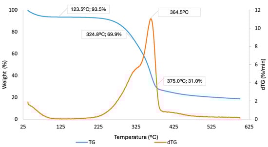The TGA and DTG curves for pine sawdust are shown in Figure 2. This analysis shows an initial mass loss of 6.5% up to 125 °C, which corresponds to the moisture removal; the second plateau corresponds to a mass loss of 23.6%, in the 125–325 °C temperature range, which corresponds to the degradation of hemicellulose; the peak at 364.5 °C in the dTG curve is associated with the mass loss due to the degradation of cellulose, corresponding to a total loss of 38.9% between 325 and 375 °C; the loss of mass recorded from 375 °C onwards, which represents 12.4% of the total mass, is associated with the degradation of lignin.