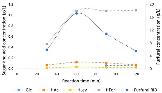 As seen in Figure 3, furfural concentrations were significantly higher than the other identified compounds, peaking at 17.20 g/L after 60 min of reaction. Furfural is generated via the dehydration of hemicellulose-derived pentoses, primarily xylose and arabinose. The absence of these pentoses in the reaction condensates, alongside the elevated levels of furfural, suggests their complete conversion during the reaction. This agrees with prior research emphasizing the efficient dehydration of hemicellulose into furfural under similar conditions [23].