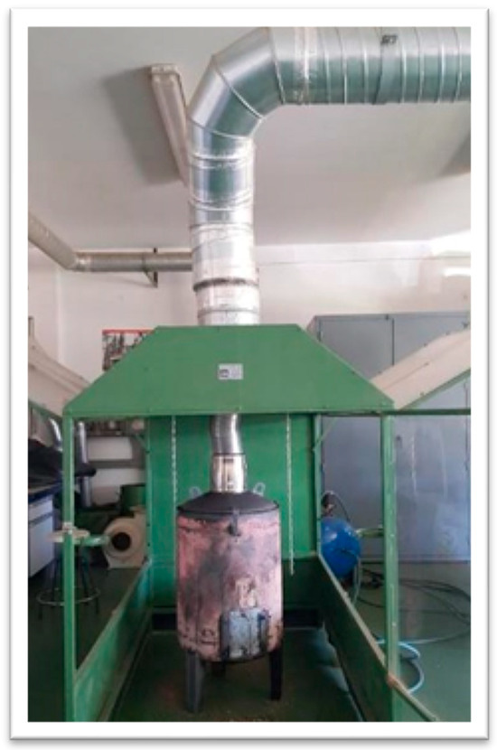 Biochar was created using a mobile double-chamber reactor (Figure 2), equipped with a 50 L internal capacity and designed for simplified operation, developed in previous works [19]. The system of the reactor was discontinuous and autonomous. One of the main aims of this technology is to achieve simple manufacturing using low-cost and effective materials and easy operation, with a mobile format, in order to employ a local biomass source.