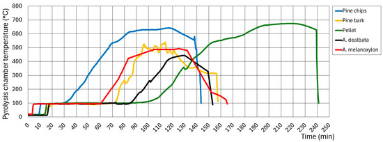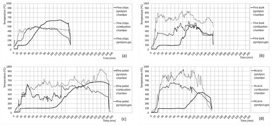 Pyrolysis processes carried out with pine chips (a), pine bark (b), pine pellet (c), and with acacia (d). Graphics show the temperatures and times of the pyrolysis chamber, combustion chamber (that provides the heating temperature), and the pyrolysis gas.