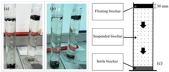 Biochar was deposited slowly on top of a graduated cylinder (measuring cylinder or mixing cylinder) of 1000 ± 10 mL to cover a 30 mm surface layer. The cylinders are transparent in order to measure the size of the floating layer and the settle layer (if settling occurs). Figure 4c shows the schematic of the test setup. The thickness of the floating biochar is measured, which is initially 30 mm. In the case of pine pellet biochar, a large proportion of it settles instantly to the bottom of the cylinder.