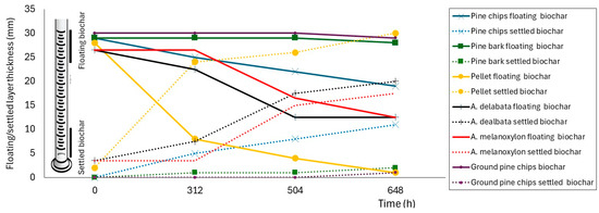 Figure 6 shows the values obtained after the floatability test. When applying the different biochar to the top of the test, some particles (small fractions) immediately precipitate, except in the case of pine bark and ground pine chips (with a bulk density of 266.0 ± [8.49] kg/m3). This is the reason why the initial values of the surface layer in the graph already start below 30 mm.
