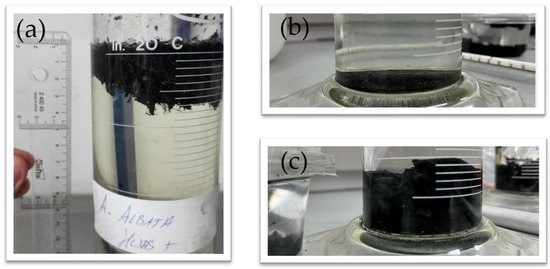 The floatability behavior was analyzed with five periodic measurements over 27 days. The water was in the laboratory temperature at around 20 °C. The measurements sought to determine both the size of the layer that remained afloat (floating layer) and the layer that formed at the bottom of the container due to the settling of the material (settled layer).