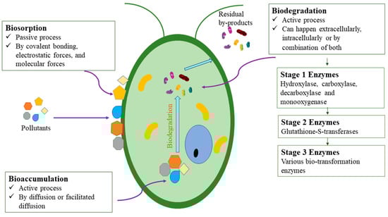 The main two categories of biodegradation are metabolic degradation and co-metabolism. Biodegradation can occur either extracellularly or intracellularly, or through a combination of both. This process involves the extracellular breakdown of toxins to intermediate forms, and then the intracellular disintegration of these intermediates. Abdelfattah et al. [44] reported that extracellular degradation is often facilitated by extracellular polymers (EPSs) produced by microalgae.