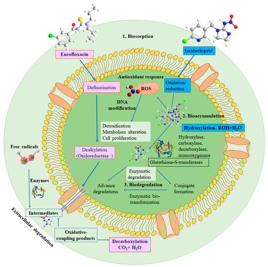 In Figure 2, a detailed cellular mechanistic diagram is displayed, explaining the enzymatic stages and various biodegradation processes involved. Examples of two different pollutants—enrofloxacin and imidacloprid—are described therein.