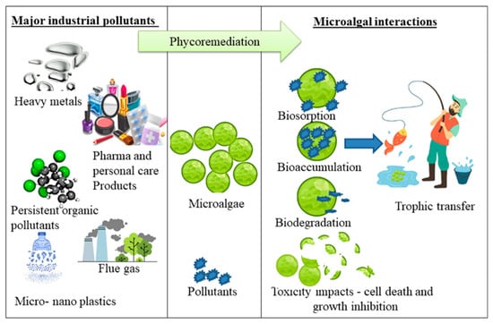 This review focuses on the recent investigations in the field of various prominent pollutants capable of influencing the environment and their interaction with microalgae, such as toxicity responses, bioremediation potential, and biomagnification possibilities, where toxins are transferred to higher trophic levels.
