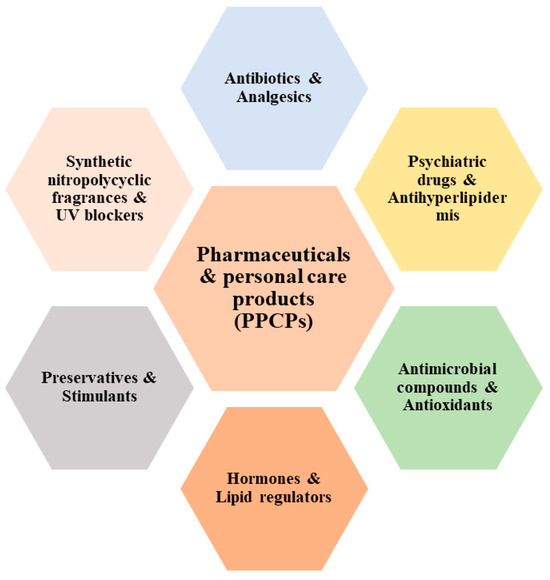 Pharmaceuticals and personal care products (PPCPs) include various chemical substances such as drugs, cosmetics, disinfectants, skin care products, fragrances, cleaning products, insect repellants, daily use household chemicals, etc. PPCPs are mostly biologically active, hormone-disruptive, and toxic; they create serious problems for the aquatic environment worldwide [104]. PPCPs are persistent and bioaccumulative in nature. In water bodies, they can exist as acidic, neutral, and basic groups. PPCPs include both human and veterinary medicines. As shown in Figure 4, PPCPs consist of antibiotics (chloramphenicol, ciprofloxacin, sulfamethoxazole, trimethoprim), analgesics (diclofenac, ibuprofen, ketoprofen, paracetamol, naproxen), psychiatric drugs (carbamazepine, primidone), antihyperlipidermis, stimulants (caffeine), lipid regulators (atenolol, bezafibrate, gemfibrozil, metoprolol propranolol), etc. In addition to these drugs, PPCPs also include synthetic nitropolycyclic fragrances, antimicrobial compounds like triclosan, UV blockers like methylbenzylidene camphor, antioxidants, preservatives like phenols and parabens, hormones (estrone E1, estradiol E2, ethynlestradiol EE2), insect repellents (N,N-diethyl-m-toluamide (DEET)), etc. The physiochemical properties of PPCPs show that they are moderately polar, soluble in water, nonvolatile, thermally unstable, and exist in a wide range of pH (acidic to basic). Except for caffeine and hormones, most of the PPCPs are manmade or produced by human activities [105].