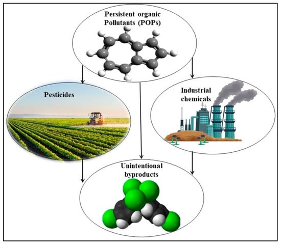 Persistent organic pollutants (POPs) are highly toxic synthetic organic chemicals with a particular combination of physical and chemical properties that resist photolytic, biological, and chemical degradation. Because of their hydrophobic and lipophilic semi-volatile nature, POPs will persist and remain unchanged for a long period of time in the environment (soil, water, and air). POPs accumulate in the fatty tissues of living organisms and enter into the food chain. POPs are categorized into three groups, as shown in Figure 5, as (1) pesticides such as aldrin, chlordane, deildrin, dicholrodiphenyltrichloroetane (DDT), endrin, heptachlor, hexachlorobenzene (HCBs), mirex, and toxaphene; (2) industrial chemical products like flame retardants (FRs); and (3) unintentional by-products such as polychlorinated biphenyls (PCBs), polycyclic aromatic hydrocarbons (PAHs), dioxins, and furans [151,152]. POPs are also released into the environment through volcanic activities, forest fires, agriculture runoff, industrial effluents, motorized vehicle exhaust, and other waste streams [153]. POPs cause health issues such as allergies, hypersensitivity, developmental changes, damage to the central and peripheral nervous systems, disruption of the endocrine, reproductive, and immune systems, cancers, and even death [154]. Therefore, the accumulation of POPs in the environment is a serious problem and needs urgent solutions. One of the potential solutions for this problem is microalgae, as microalgae can degrade POPs enzymatically and use them as nutrients.
