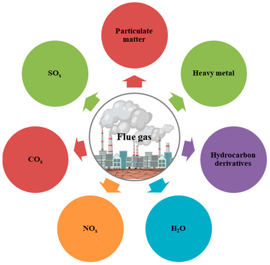 Flue gases are a mixture of combustion products generated either by incineration (direct combustion) or an indirect oxidation of a combustible material or syngas [183]. Flue gas mainly contains nitrogen, moisture (water vapor), carbon dioxide, particulate matter (dust), sulfur oxide, nitrogen oxides, and carbon monoxide, as shown in Figure 6. Apart from these constituents, flue gas contains hydrogen fluoride, hydrogen chloride, hydrocarbon derivatives, and heavy metal derivatives, depending on the burning materials and combustor [184]. Power plants and cement production plants are a major source of flue gas. Other sources include industries such as lime production and use, soda ash production and use as well as chemical and metal production industries [185].