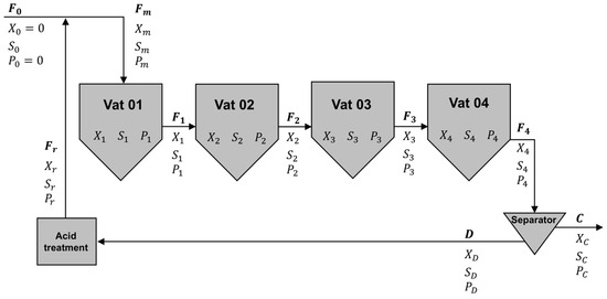 For the mathematical modeling of the bioprocess, the original flowchart was adapted as shown in Figure 2.