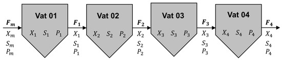 The experimental data used in this study are from the operation of a continuous multistage alcoholic fermentation process on an industrial scale, whose simplified flowchart for mathematical modeling purposes is presented in Figure 1.