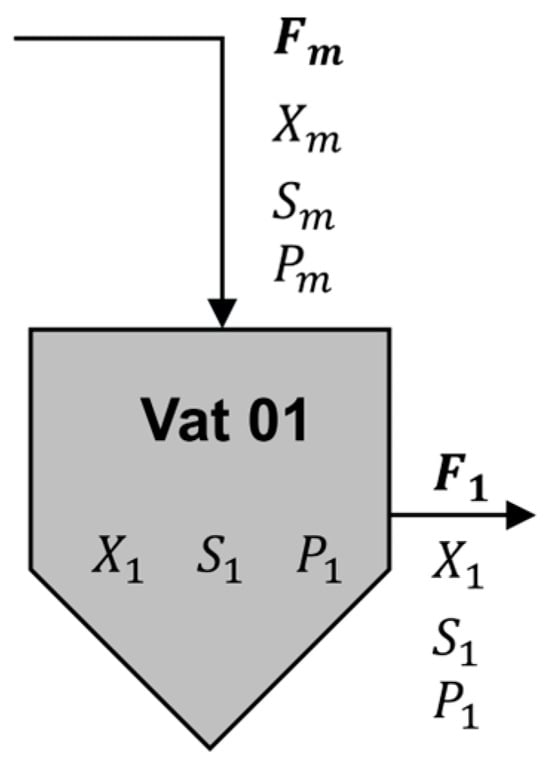 To elaborate the mass balances in the first vat, the scheme presented in Figure 3 was considered, obtaining Equations (6)–(8), in which the inlet conditions in this vat (Fm, Sm, Xm, and Pm) were determined from the properties resulting from the mixing of the system feed stream with the recycle stream.