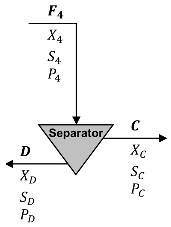 Figure 4 shows a scheme of the biomass separator, with the mass balances in this unit given by Equations (9)–(11):