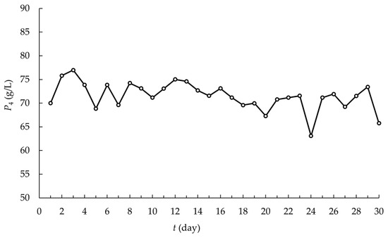Figure 6 shows the behavior of the daily ethanol concentration in the outlet stream of the fourth vat, which is equal to the concentration at the system outlet (P4). Changes in this variable were most likely due to variations in S0, with direct effects on the concentration of ethanol produced.