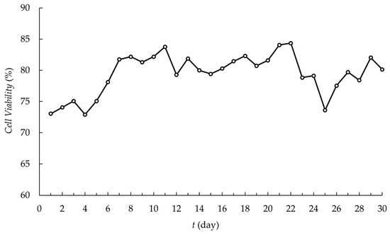 Figure 7 shows the percentage of viable cells in the first vat of the fermentation system. It can be seen that high levels of cell viability were observed in this vat, resulting in high activity of the microbial population, which in turn provided a significant consumption of substrate in this vat.