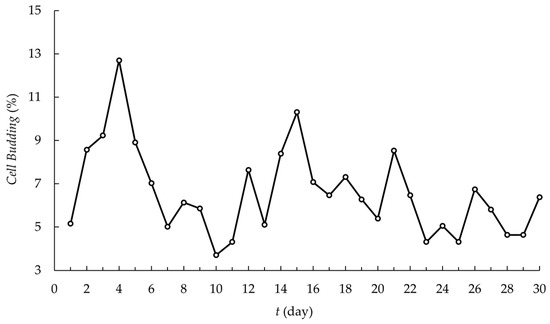 Figure 8 shows the behavior of the cell budding percentage in the first vat of the fermentation system. This parameter is an indirect measure of biomass growth, and its changes are related to variations in cell concentration. It can be seen that, disregarding some outliers, the budding percentage fluctuated moderately, around 7%.