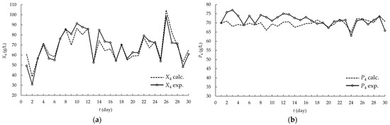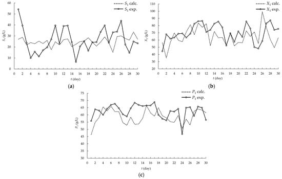 Another way of testing model validity is to plot predicted versus experimental values, generating a scatter plot [39]. This will allow for an assessment of the fit quality of the mathematical model, providing a 45° straight line for a perfect fit. Ideally, the points will cluster tightly around the 45° line, indicating a strong correlation and a well-fitting model. Deviations from this ideal line suggest bias or other forms of poor model performance, which can be quantified by the joint values of the coefficient of determination R2 and the slope “a” of the straight ycalc. = a·yexp. line obtained in the suggested linear regression, where y stands for variable X, P, or S. The closer these values are to 1, the better the model fits the experimental data. Table 5 presents the results of such procedure for the vats where predicted and experimental data were available. It can be observed that, according to the postulated criterion, the proposed mathematical model can be validated, since it presented statistical indicators that are favorable to its validation. The variable for which the model presented the lowest degree of predictability was the substrate concentration, although it was at an acceptable level. These results indicate high robustness of the model and high credibility in its predictions.