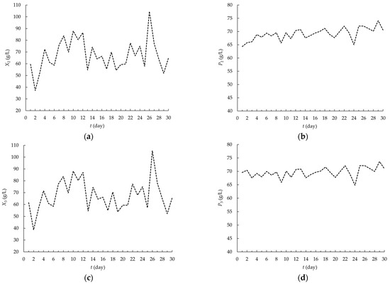 The experimentally measured response variables were the concentrations of substrate (S), and product (P) in the first and fourth vats, during 30 days of bioprocess operation, with the vat volumes being V1 = V2 = V3 = V4 = 600 m3.