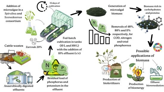 - Magro, F.G.; Freitag, J.F.; Bergoli, A.; Costa, J.A.V.; Colla, L.M. Microalgae Consortia for Post-treating Effluent of Anaerobic Digestion of Cattle Waste and Evaluation of Biochemical Composition of Biomass. BioEnergy Res. 2021, 15, 371–384. [Google Scholar] [CrossRef]