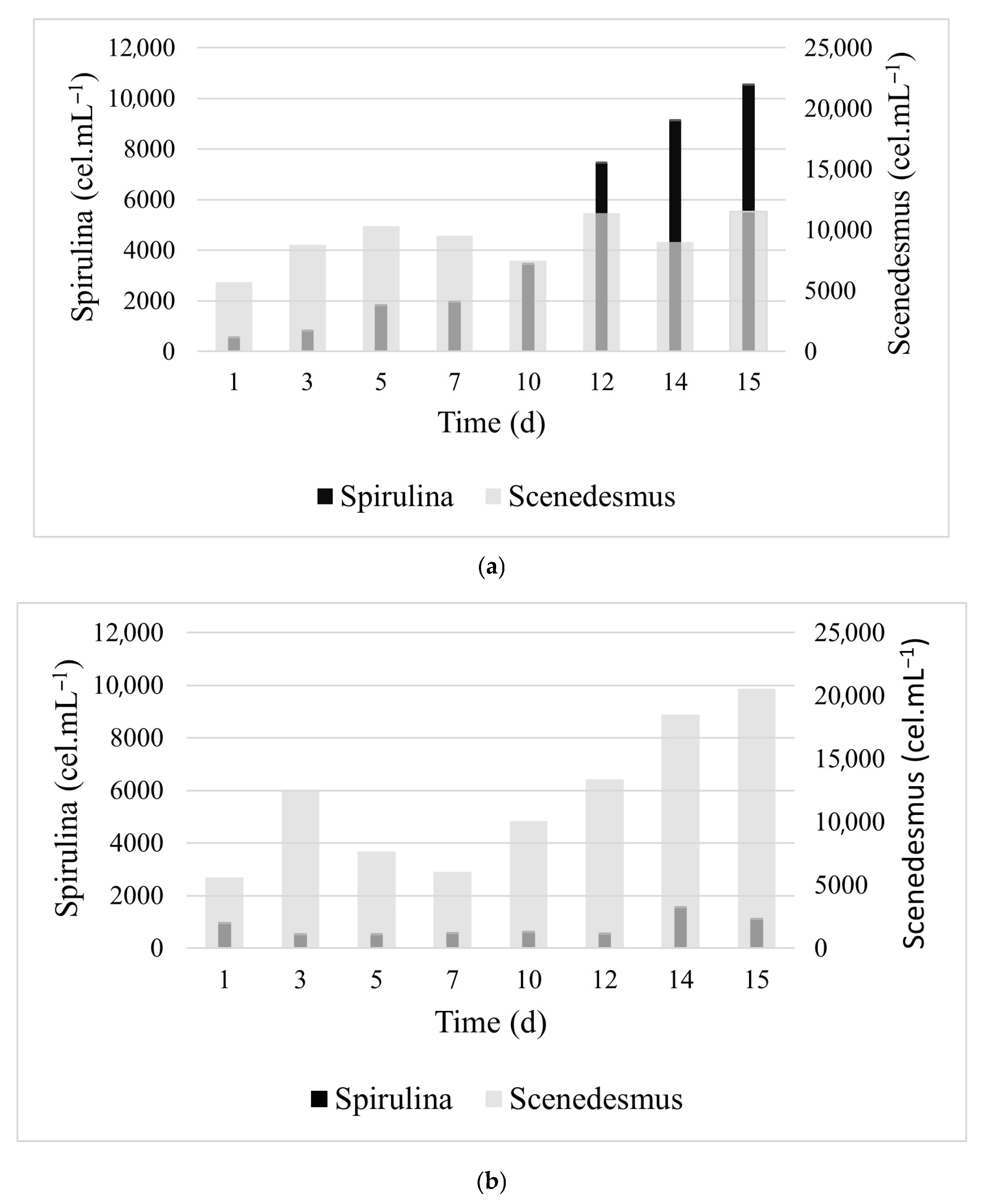 - Margarites, A.C.; Volpato, N.; Araújo, E.; Cardoso, L.G.; Bertolin, T.E.; Colla, L.M.; Costa, J.A.V. Spirulina platensis is more efficient than Chlorella homosphaera in carbohydrate productivity. Environ. Technol. 2016, 1, 2209–2216. [Google Scholar] [CrossRef]