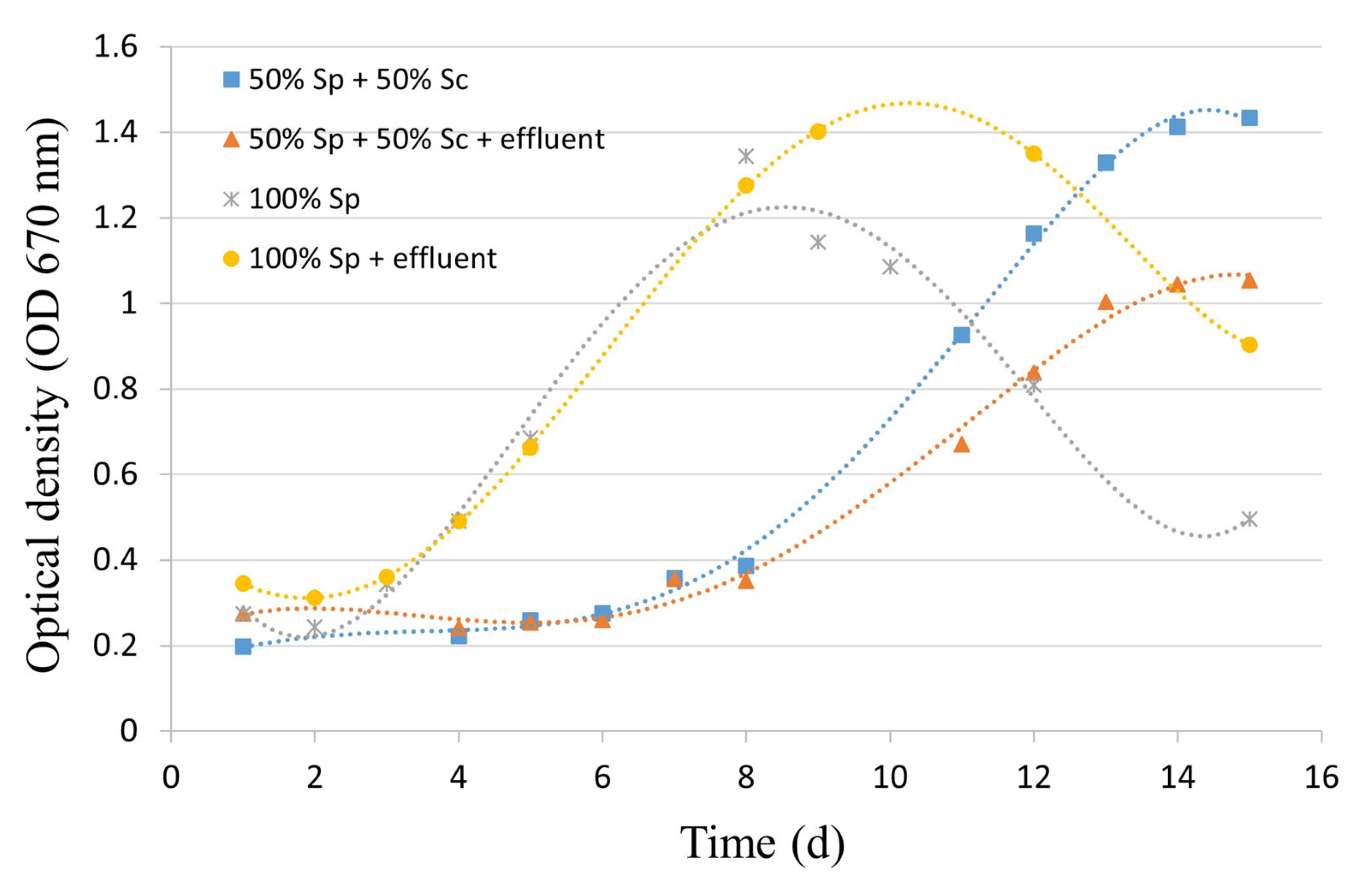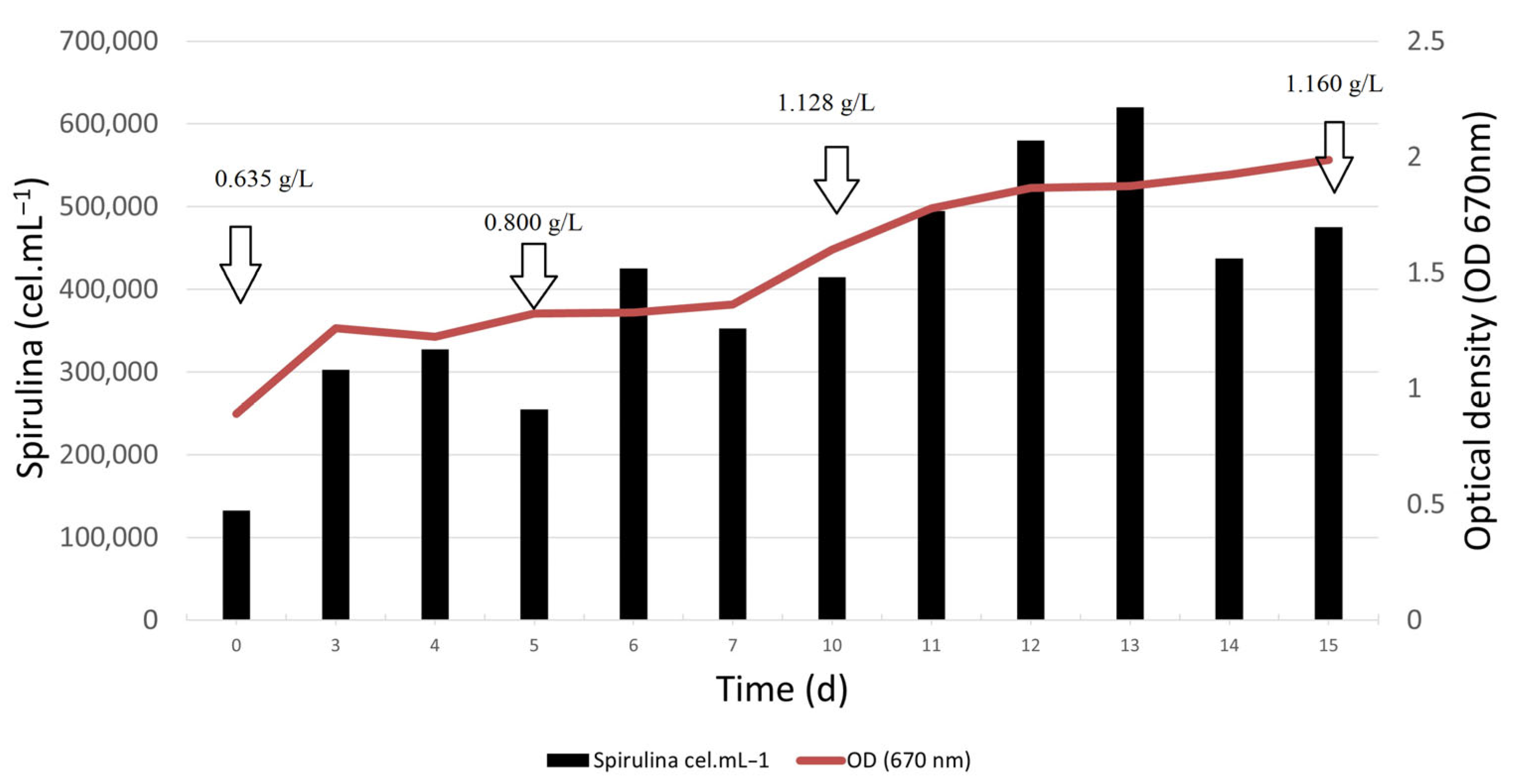 - Hultberg, M.; Lind, O.; Birgersson, G.; Asp, H. Use of the effluent from biogas production for cultivation of Spirulina. Bioprocess Biosyst. Eng. 2017, 40, 625–631. [Google Scholar] [CrossRef]