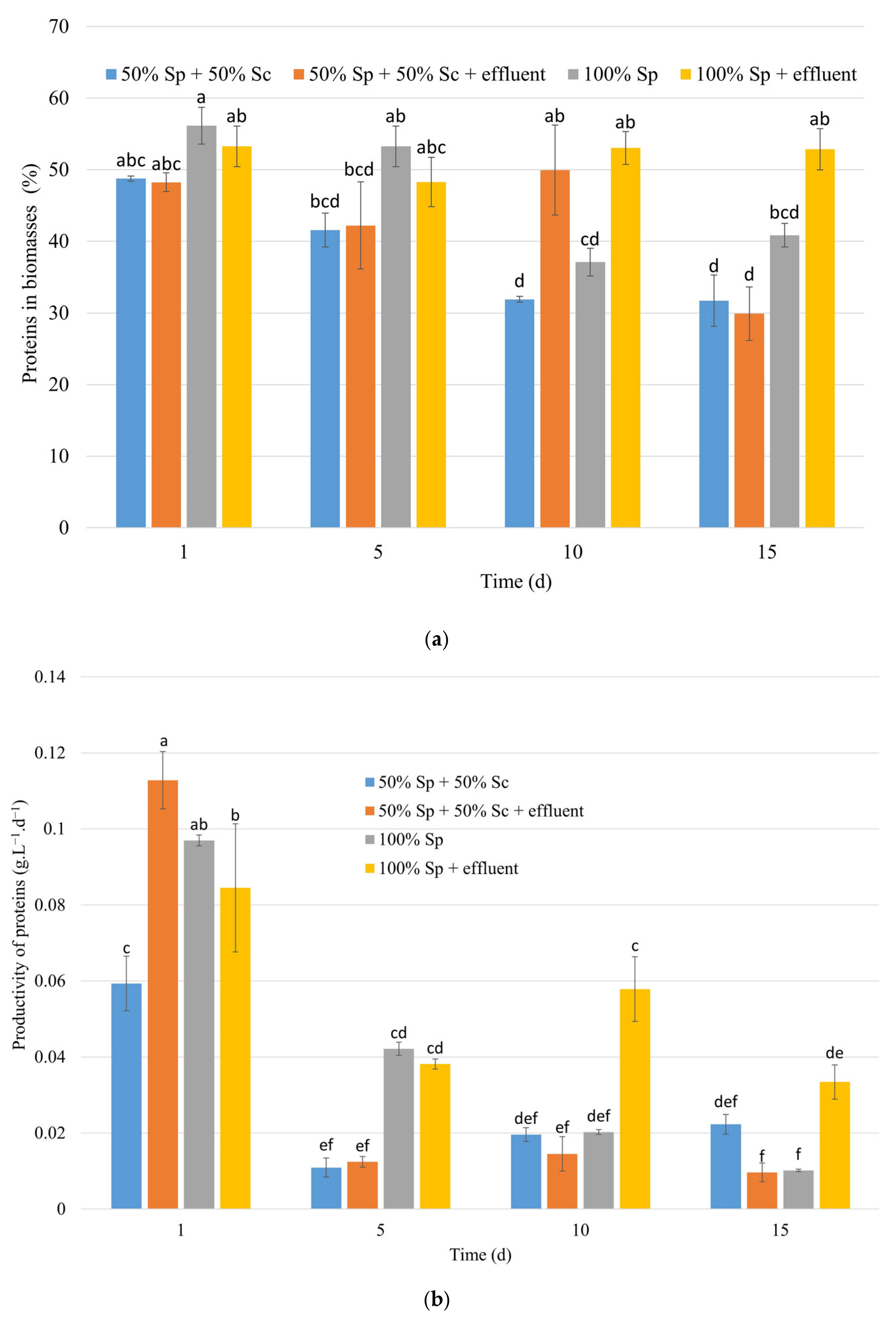 | Time of Cultivation (days) * | Carbohydrates (%) | Proteins (%) | PCHO (g·L−1·day−1) | PPTN (g·L−1·day−1) |