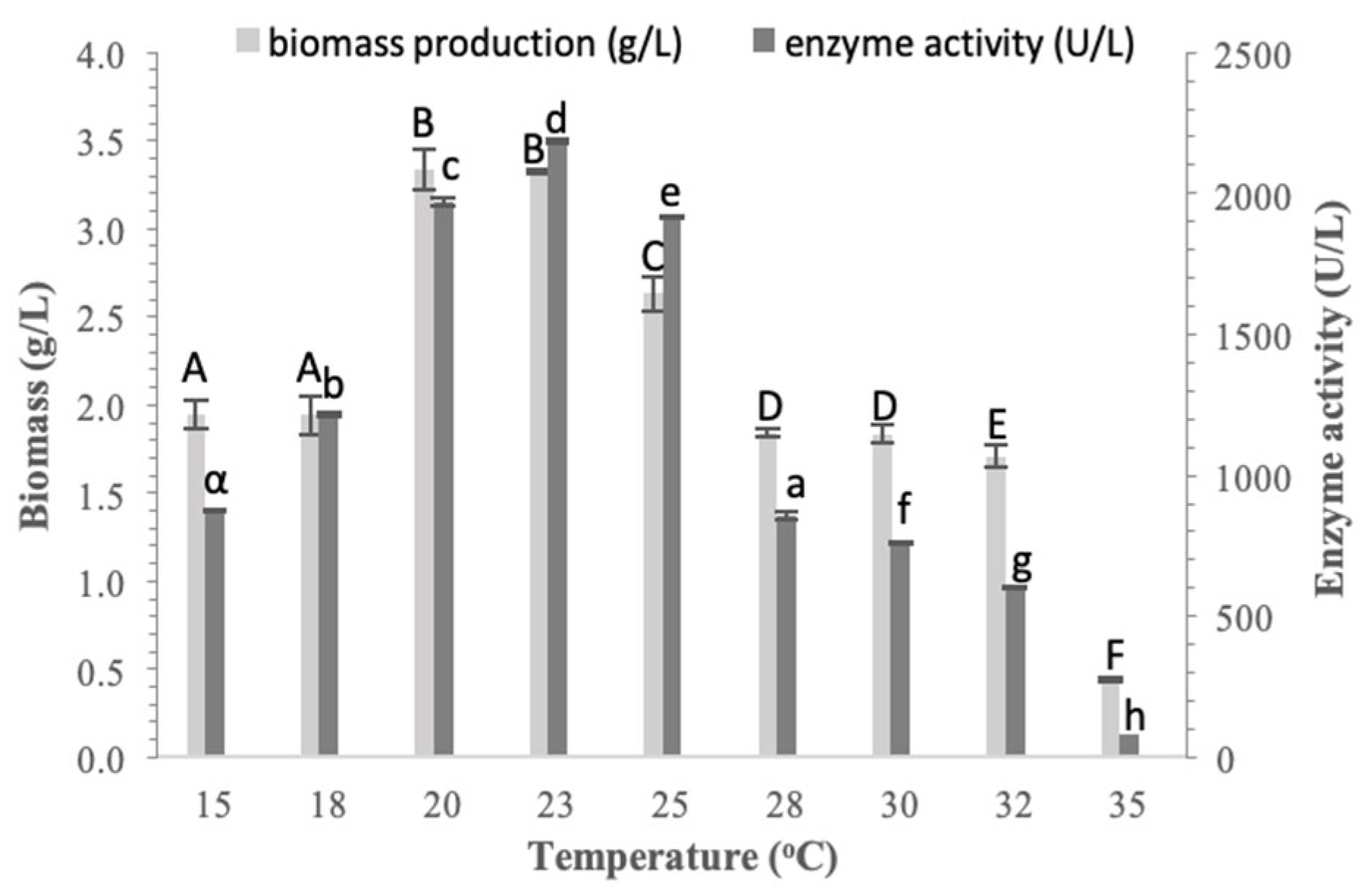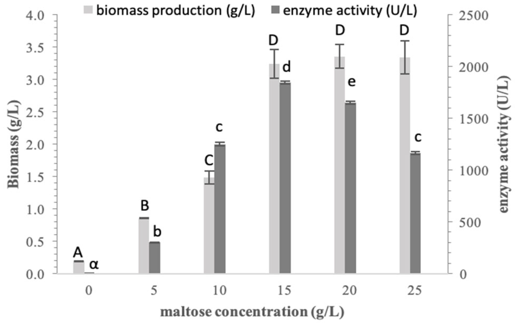Cells were cultivated with maltose concentrations ranging from 0 to 25 g/L for carbon source optimization. After selecting the optimal maltose concentration, the next step involved the selection of nitrogen source among 6 organic and inorganic options, followed by determination of the optimal concentration. Continuing with another external factor, growth and enzyme production were assessed across nine temperatures settings.