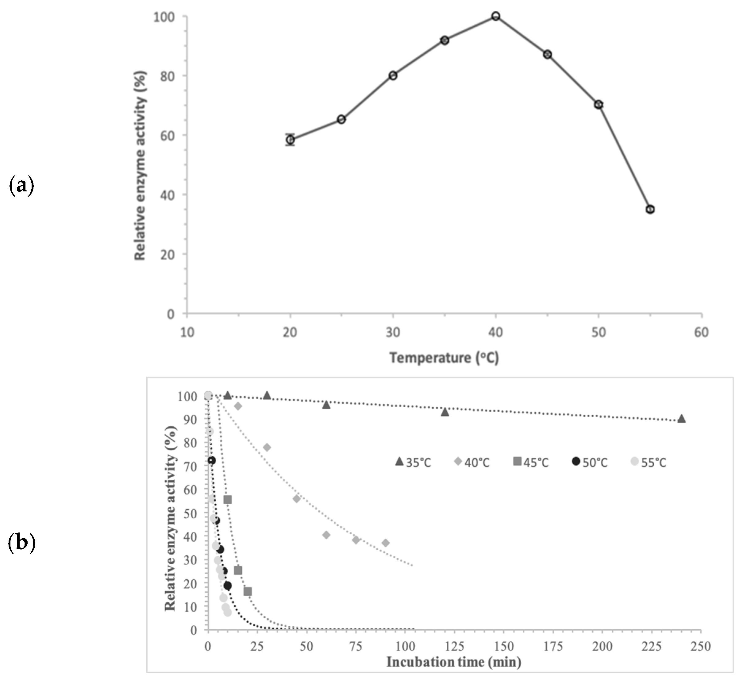 Isothermal deactivation was evaluated at temperatures ranging from 40 to 55 °C in 100 mM citrate-phosphate buffer (pH 6.0). Aliquots were collected and immediately cooled at various times, after which the residual enzyme activity was determined under standard assay conditions.