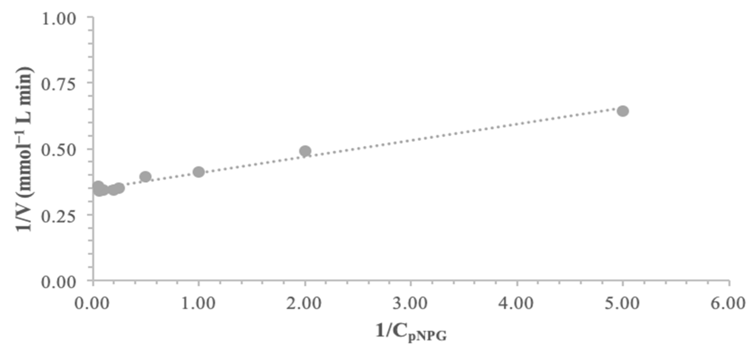 max were calculated, through linear regression fitting on 1/v (1/velocity) vs. 1/substrate data on the Lineweaver–Burk plot at 40 °C, yielding 2.0 mM and 2.9 μmol min