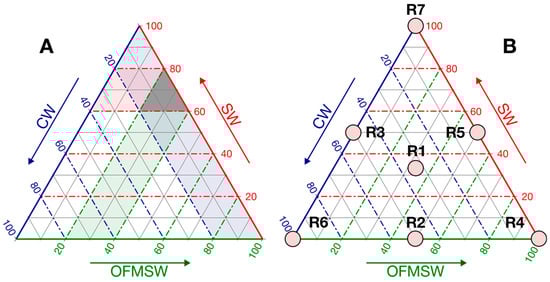 Ternary mixture comprising the organic fraction of municipal solid waste (OFMSW), swine wastewater (SW), and cheese whey (CW). (A) Operative window defined by process constraints, represented by the shaded gray area. (B) Operative windows expressed in pseudo-coordinates. The red, blue, and green axes correspond to SW, CW, and OFMSW, respectively, and the dotted lines represent isoproporportion levels for each component. Points R1–R7 correspond to the experimental conditions defined by the restricted simplex centroid mixture design.