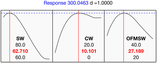 To evaluate model robustness, sensitivity analyses was performed by relaxing the target to 0.90 ≤ d ≤ 1.00, thus defining a high-performance region rather than a single optimum. Contour and 3-D plots were generated to visualize both the location of the maximum and the surrounding robust region within the SW–CW–OFMSW simplex. All optimization analyses were conducted using Minitab 15 (Minitab LLC, State College, PA, USA).