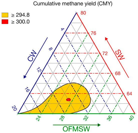 CMY [NmL CH4 g−1 SV] = 250.94·x1 + 295.19·x2 + 272.27·x3 − 61.8·x1·x2 − 45.4·x1·x3 + 40.6·x2·x3 + 739·x1·x2·x3